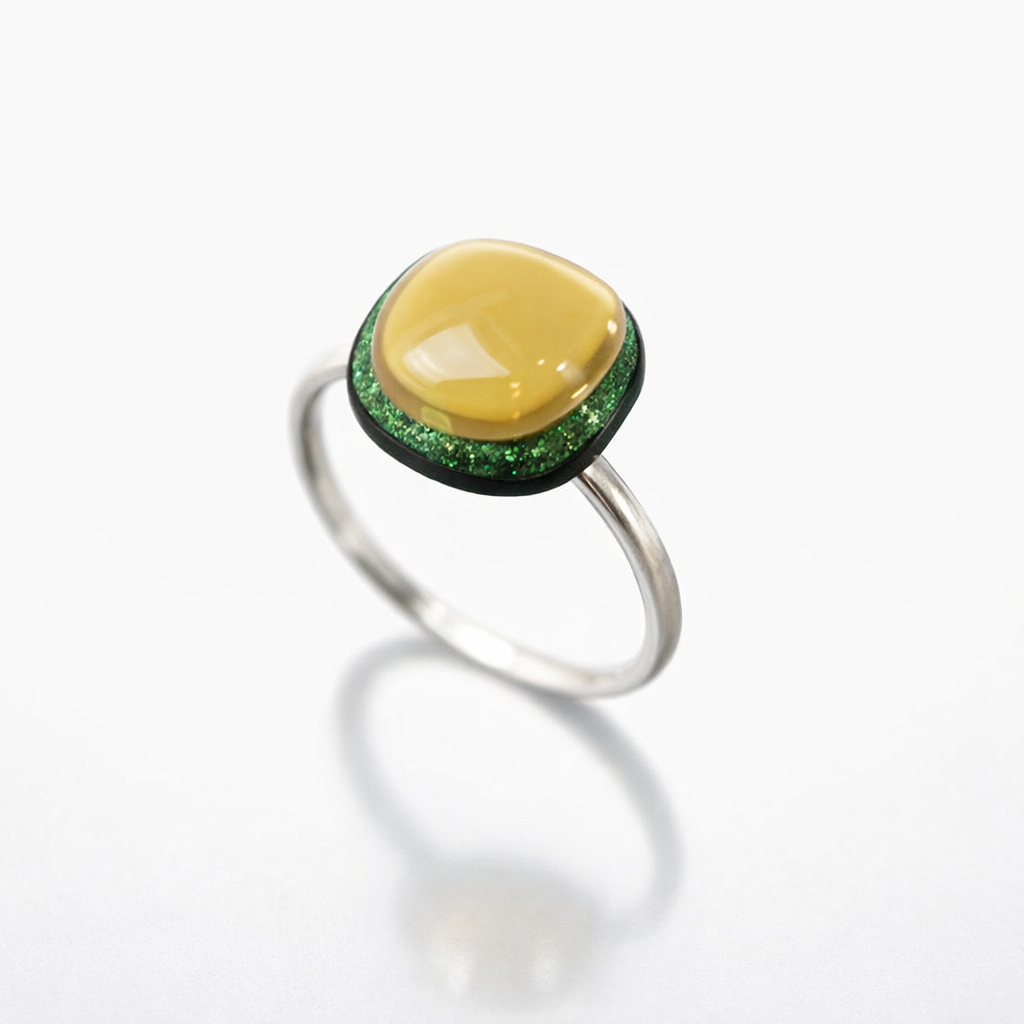 Sterling silver ring with caramel and green glass insert - warmth held in balance with quiet depth
