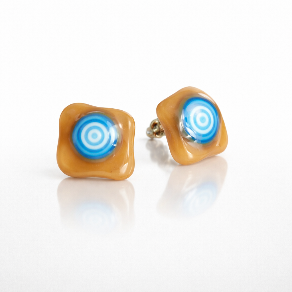 Caramel Glass earrings with blue Spiral pattern suspended inside the form