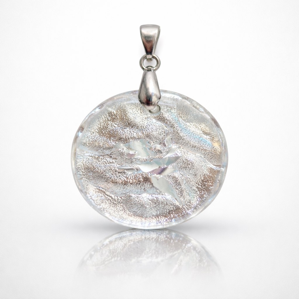Handmade transparent glass pendant with silver dichroic glass and silver foil, round artisan glass jewelry.