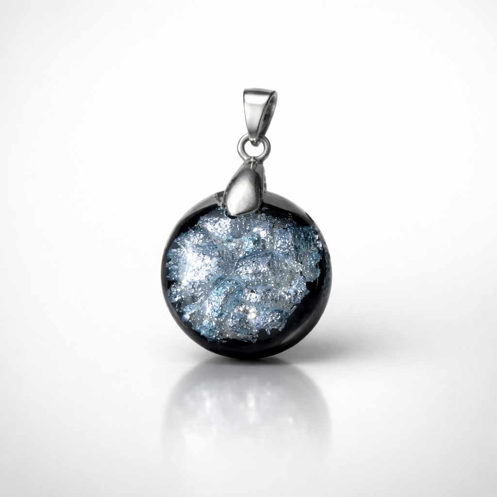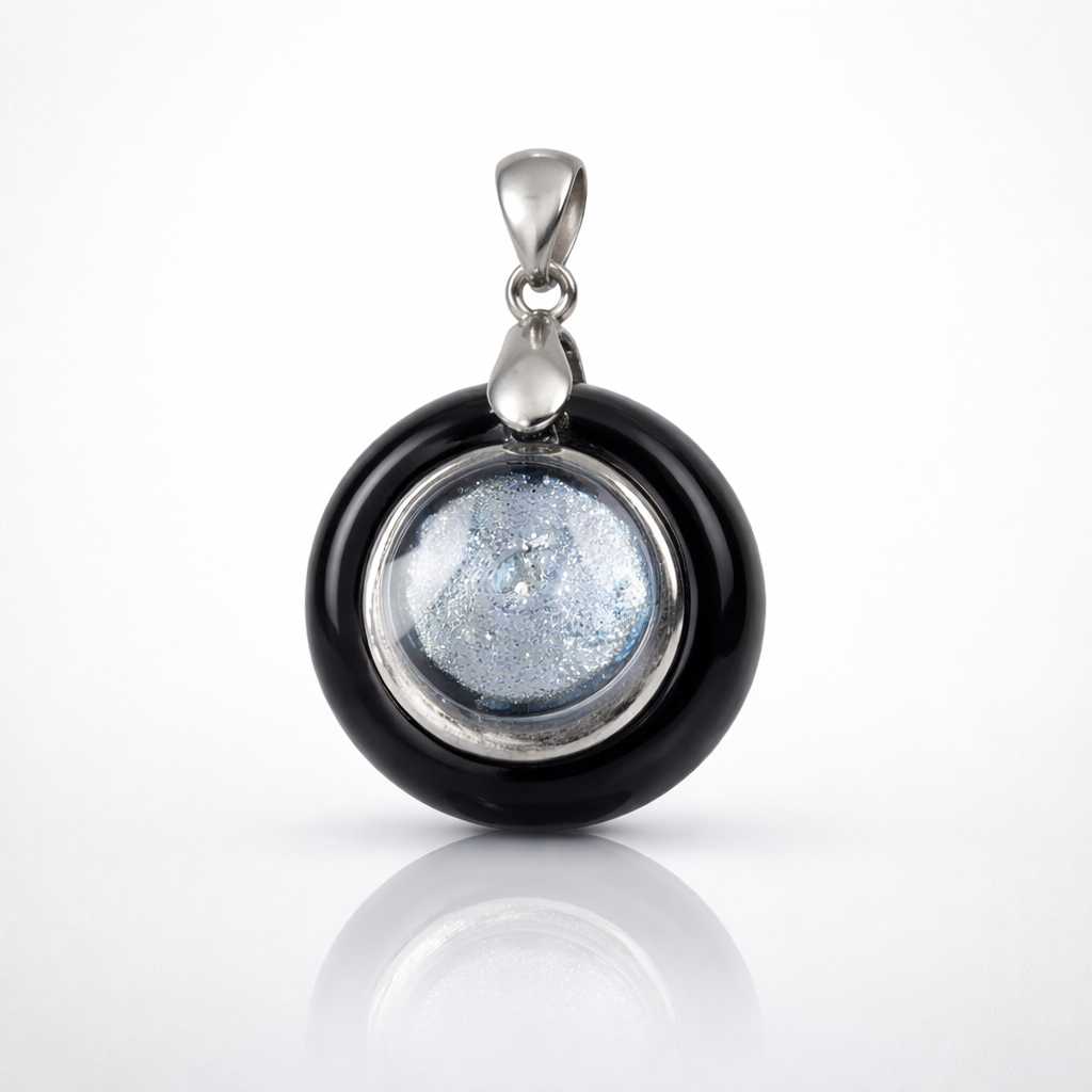 Black glass pendant with smooth silver dichroic center, minimalist handmade glass jewelry.
