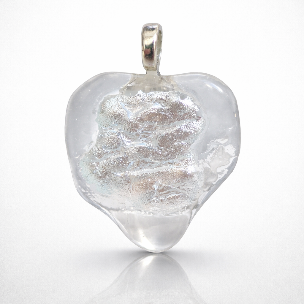 Transparent glass pendant with silver dichroic glass, organic leaf shape, handmade minimalist jewelry.