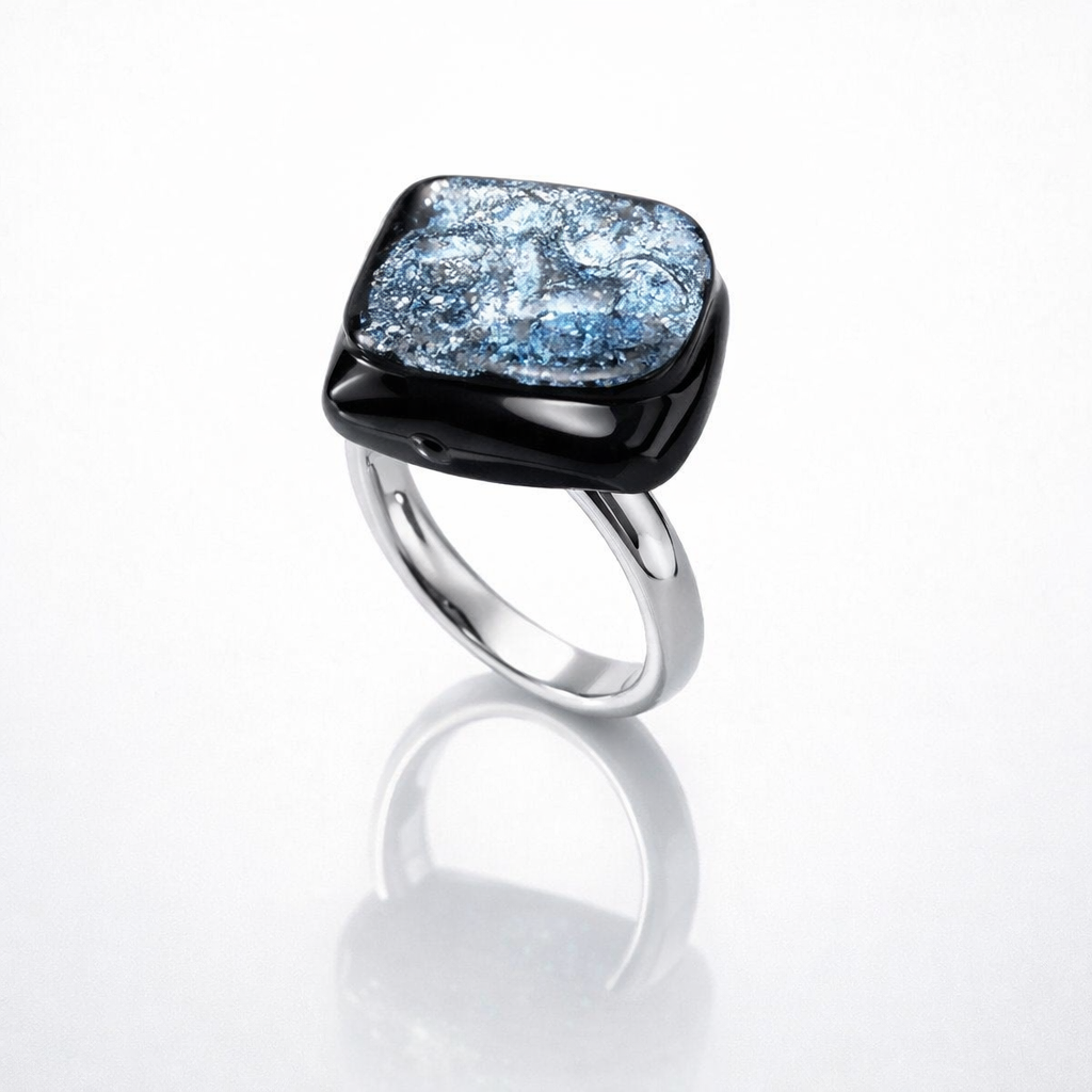 Sterling silver ring with black glass and silver dichroic insert, handmade modern glass ring.